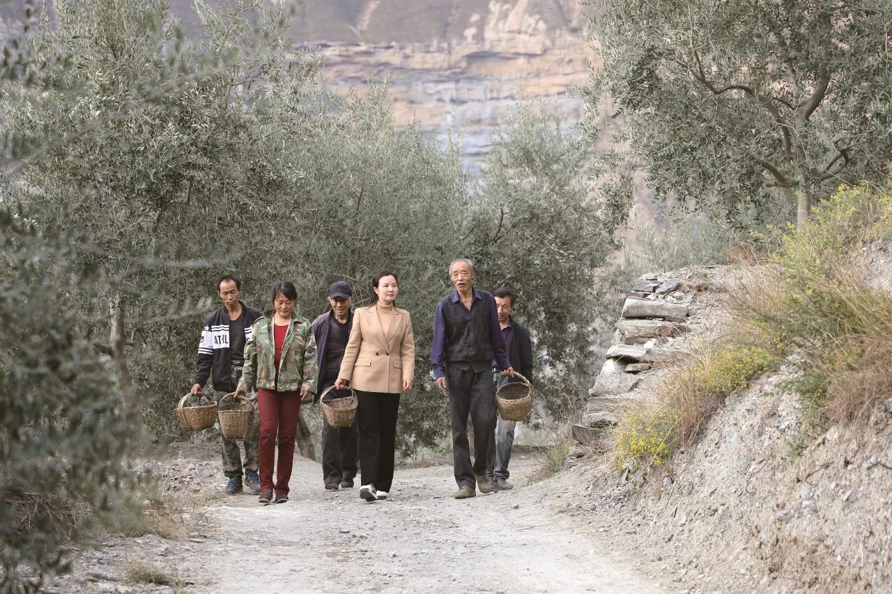 祥宇公司董事長(zhǎng)劉玉紅(右三)與當(dāng)?shù)剞r(nóng)戶一起進(jìn)山采摘油橄欖鮮果。